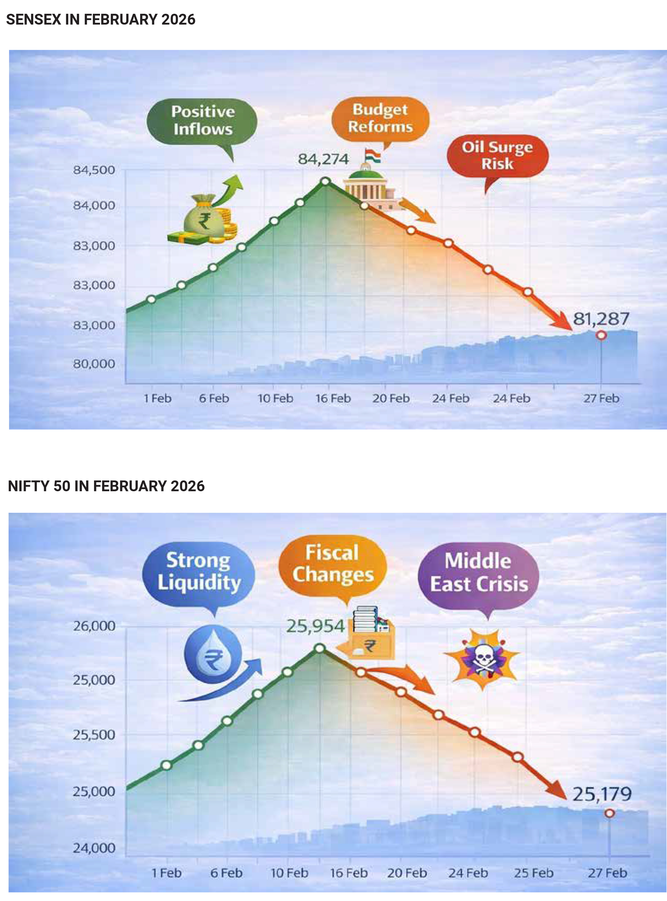 February 2026 proved to be a month of sharp cross-currents for Indian equity markets. After an early surge and multiple volatility spikes, the Sensex closed the month with a modest decline of roughly 1–1.3%. While the headline number suggests a mild pullback, the internal churn beneath the surface was far more dramatic, driven by sector-specific shocks, policy surprises, shifting foreign flows, and global macro tensions.