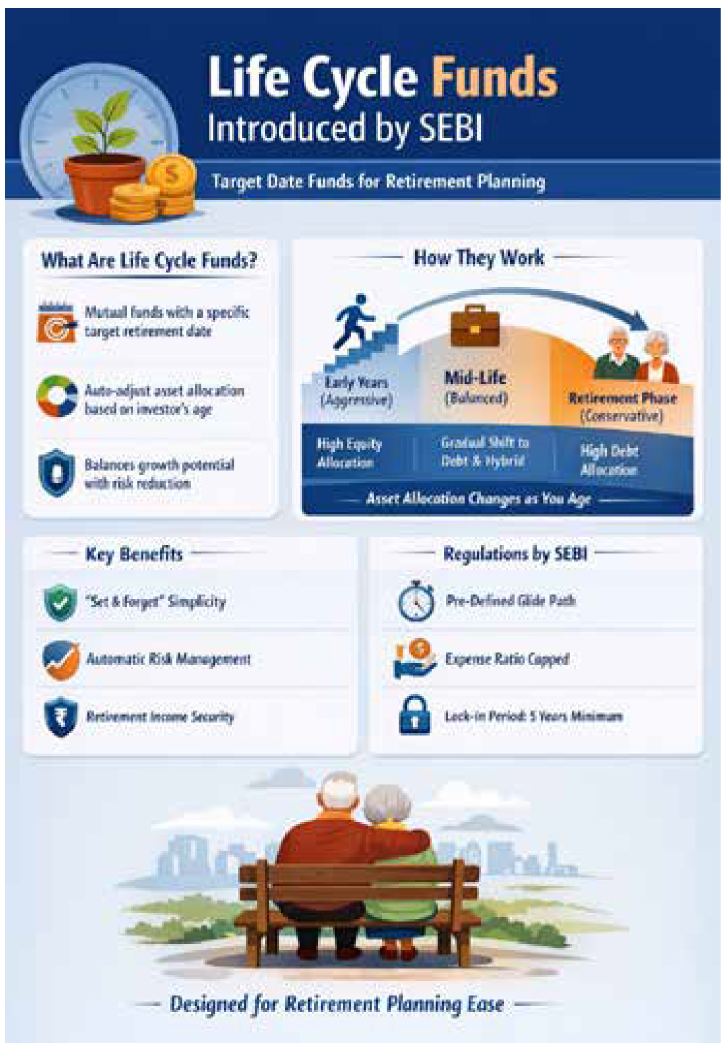 The headline innovation is the introduction of Life Cycle Funds—open-ended schemes with fixed tenures (5–30 years) and automatic glide paths. These funds begin equity-heavy and gradually shift toward debt as maturity approaches, aligning risk with investors’ life stages. With graded exit loads and disciplined asset transitions, they aim to reduce emotional investing and simplify long-term planning. Implementation begins immediately, with phased compliance through 2029—marking one of the most comprehensive mutual fund reforms in recent years.